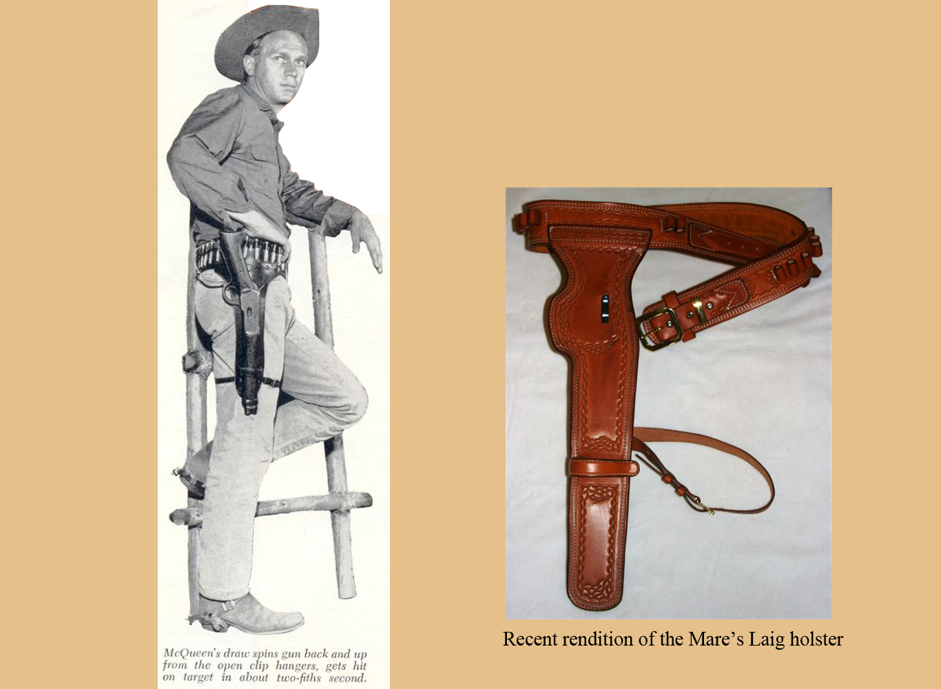 With a bit of research, I found an entire magazine article from 1961 about the Mares’ Laig. Volume Five of “Guns Quarterly” has what I think is a fascinating and well-written article by John Lachuk that details the genesis of the Mare’s Laig and a lot of information about McQueen regarding the TV series and the gun. I won’t spoil your enjoyment of the article, if you read it, by repeating what much of Lachuk wrote. I will say that McQueen, when asked why he calls the gun the Mare’s Laig, said, “Because, it’s like a hog-leg only it kicks harder – at both ends!”